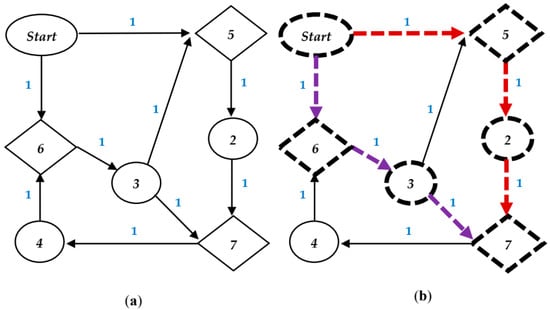 The model in (1)–(3) is applicable for describing and solving path extraction problems on unweighted graphs. In this case, it is sufficient to set in (1)–(3) and ; then, obviously, the objective function will represent the total number of edges in the extracted path. This problem turns into the standard critical path problem (PERT-CPM) if the set is empty and into the shortest path problem if the set is empty [28,29].