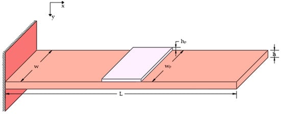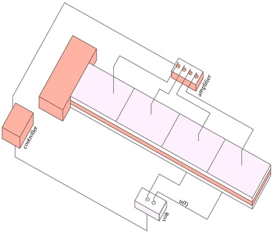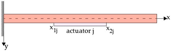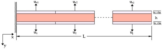 Figure 2 shows the actuator integrated into the beam. This figure shows the ends of the actuator used in further equations, which are very important for the electrical matrices of our system. All modeling is based on Equation (1) [33]; from the solution of this equation, the results are given in the time domain. The results without control are given by applying the differential, whereas the results with control are given after the application of the infinity control.