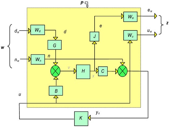 Nominal performance in Simulink, where Wd, Wn, Wu, and We are the whets of our system for disturbances (d) noise (n), control vector (u), and error (e); x is the state vector and y is the output; in the displacement the rotation and the control vector (u), K is our control (H-infinity or H2). In the results, we take the diagram for the open loop (without control) with H-infinity and the H2 controller.