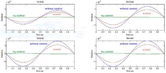 In Figure 14, the four nodes of the smart structure rotations are depicted for three different scenarios: with H2 control, H∞ (H-infinity) control, and without any control. The results clearly show that H∞ control provides the best performance, as the rotations are nearly zero. This indicates that the H∞ control method is highly effective in minimizing rotational movement systems [1,6,7,11,25,26,27,29,30,31,35].