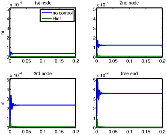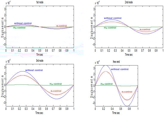 Similarly, Figure 15 illustrates the displacements of the four smart structure nodes under the same three scenarios: with H2 control, with H∞ control, and without control. The comparison reveals that H∞ control yields a superior outcome. The displacements were almost zero when the H∞ control was applied, demonstrating its effectiveness in minimizing positional deviations. Thus, the H∞ control proved to be the most effective method for reducing both rotations and displacements in smart structures.