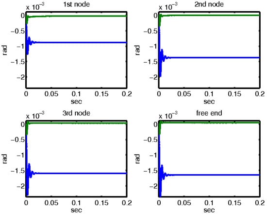 Figure 17 depicts the rotations for all the nodes of the smart beam using the H-infinity control criterion. The findings were exceptionally impressive as the displacements were nearly imperceptible. This underscores the efficacy of the H-infinity control approach in reducing displacements to a minimum, thereby ensuring the structural integrity and stability of the smart beam under static loading scenarios. The minimal rotations for all the nodes of the smart beam highlight the superior performance and robustness of the implemented control system.