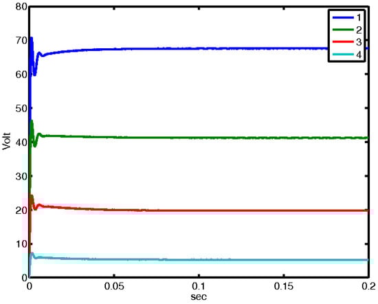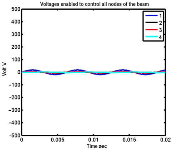 Control voltages for all the nodes of the smart structures under sinusoidal disturbances. The numbers 1, 2, 3, and 4 correspond to the four piezoelectric actuators (voltages) present in the smart beam.