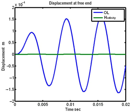 Smart structure’s free end displacement with (H-infinity) and without control (open loop, OL).