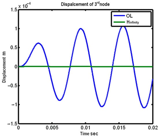 Displacement of the 3rd node of the smart structure presented with (H-infinity) and without control (open loop, OL).