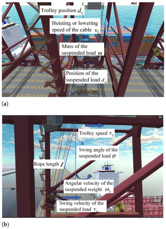 The risk simulation module is developed based on one of the most significant risks that remote quay crane operators face during operations—collisions. It identifies and collects key data that could lead to collision risks during operations. These data help determine which operational methods and strategies employed by drivers are effective and safe. Therefore, in the automated quay crane remote operation simulator, this study uses the simulator’s sensor system to capture environmental information and record key data at every time point during the skilled drivers’ operations, including actions, speed, position, and the safety distance between the crane and the operational target. The specific data recorded are listed in Table 2, and Figure 2 illustrates the parameters corresponding to Table 2. The physical quantities recorded in this study are classified into constants, control variables, and passive measurements. Control variables are those that the driver can manually control via the joystick, while passive measurements are the variables measured by the system during the driver’s operation. All variables in this study use the International System of Units (SI), and the ranges of other variables are specified in Equations (10) and (11).