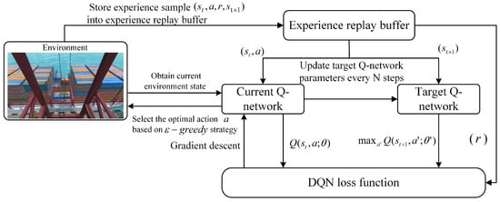 Figure 4 shows a flowchart of the model training using the DQN algorithm based on skilled driver data. First, the sensor system is used to collect environmental information from the simulated port operation scenario. Then, the current environmental state information of the port operation scene is input into the evaluation network, which outputs the Q-values of each action in the action space. Based on the policy, an action a is selected, and the spreader executes it to obtain a reward r, transitioning the spreader to a new state . The current state , action a, next state , and reward are stored as historical experience information in the experience replay pool.
