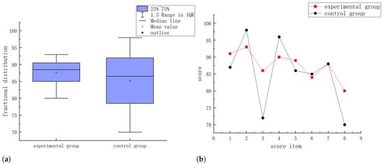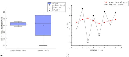 Figure 5 and Figure 6 show the distribution of scores for Drivers 1 and 6. In both figures, (a) are box plots and (b) are line graphs. From these figures, it can be seen that, compared to the control group, the score distribution in the experimental group was more concentrated. The score fluctuations for most drivers in the experimental group were smaller, while the score fluctuations in the control group were larger, demonstrating greater dispersion. Compared to the control group, although the final results for the novice drivers were the same, the evaluation method based on the reference model was more stable and objective than the traditional manual scoring method and better reflected the deficiencies of the novice drivers during the scoring process.