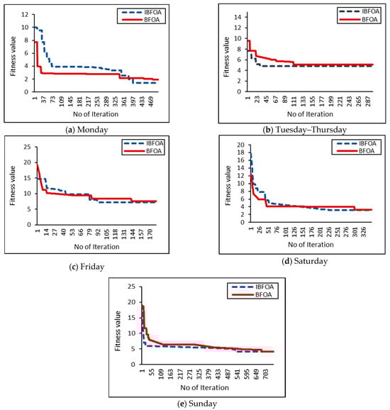 Evolutionary algorithms, inspired by natural selection, hold promise in identifying optimal parameter configurations for SVM, potentially leading to enhanced forecasting accuracy [28]. Among evolutionary algorithms, the BFOA garners significant recognition for its unique strengths. It excels in simultaneously exploring a vast search space (encompassing both global and local optima) and leveraging a multi-center approach [29]. The recent evolution of BFOA has improved its configuration to overcome the shortcomings of standard BFOA in terms of complexity, execution time, and convergence curve. The capability of BFOA has yielded promising results when applied to complex optimization challenges within the power system domain, such as load shedding [30,31], electric vehicle charging stations [32], frequency stabilization in hydropower systems [33], control of multi-machine power systems [34,35], economic dispatch [36], and power distribution restoration [37].