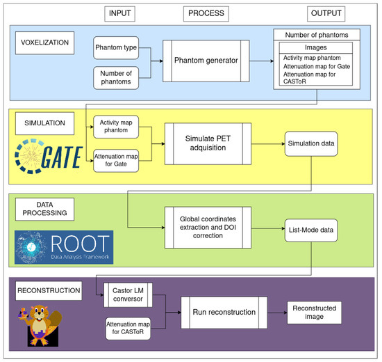 The data obtained from these simulations were stored in a ROOT file that registered the coordinates, energies, and many other variables of PET acquisition. ROOT [23] is a framework developed by CERN (Conseil Européen pour la Recherche Nucléaire) for scientific data analysis, used mainly in the nuclear physics field.