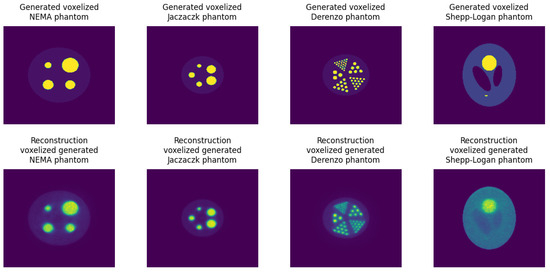 Finally, from the FID, it can be interpreted that in the NEMA and Derenzo cases, the voxelized images and the reconstructions were quite similar, as the FID score value was close to zero. For the Jaczaczk and Shepp–Logan cases, the FID score was also relatively low. However, it indicated that the reconstructions of these phantoms were not as good as in the other cases. Nonetheless, considering that the results were below the value where they would be considered similar and of high quality, it can be stated that this metric is also in accordance with the results obtained so far.