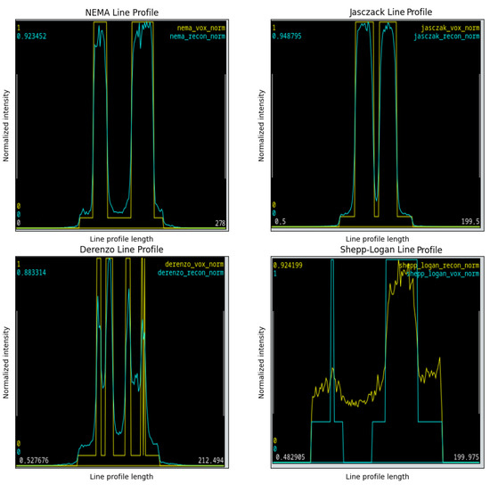 Figure 5 shows that the NEMA, Jaczaczk, and Derenzo reconstructed images showed good agreement with the original voxelized images because the intensities in the regions of interest were similar. In the case of the Shepp–Logan line profile, the line profiles were quite different; this was due to the more complex geometry of the Shepp–Logan phantom; the acquisition was more computationally expensive, which means we had lower total coincidence for the same simulation time compared with the NEMA, Jaczaczk, and Derenzo cases, resulting in a worse line profile. Nonetheless, the region of maximum intensity showed fairly good agreement in the voxelized and reconstructed phantoms. The acquisition times should be longer for the Shepp–Logan-like phantoms to address this issue. From the information provided from the line profiles, we can confirm that the reconstruction obtained from the simulated data in GATE was successful, as the direct comparison of the voxelized image and the reconstruction was consistent.
