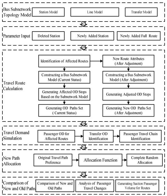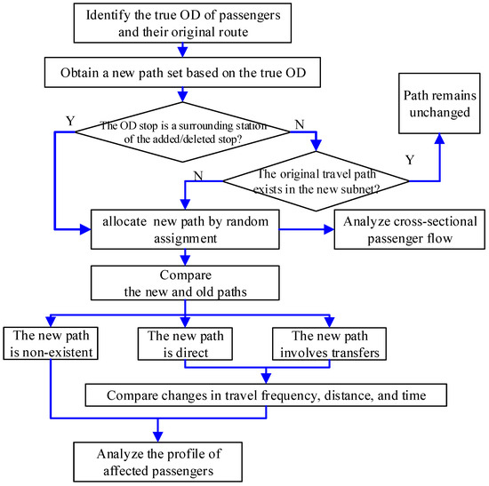 Next, we assign passengers to the new network by comprehensively utilizing actual travel demand, available travel path sets, and path selection models. Finally, the changes in the number of trips, the timeliness, and various other aspects before and after the line adjustment are analyzed from the perspective of individual passengers. Following this, the relevant group analysis can be conducted by integrating the results with passenger profiles. The technical route is shown below in Figure 1.