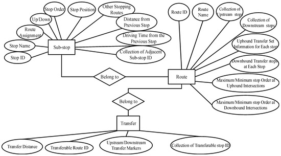 The network model should meet requirements in terms of identifying the influence range of line adjustments, the path calculations, the route selections, and so on. One can assume that the line adjustment will only affect passengers on the ‘associated’ lines, including logical and spatial related lines, so the key to designing a bus network model is to reflect the spatial and logical relationship (such as subordination and transfer) between different stops, as well as the relationship between stops and lines. The bus sub-network model can be defined as the integration of stops, routes, and transfer information with all lines that intersect or overlap with the adjusted lines. Classified by elements, this model can be divided into a sub-stop model, route model, transfer model, and various other levels, as shown below in Figure 2.
