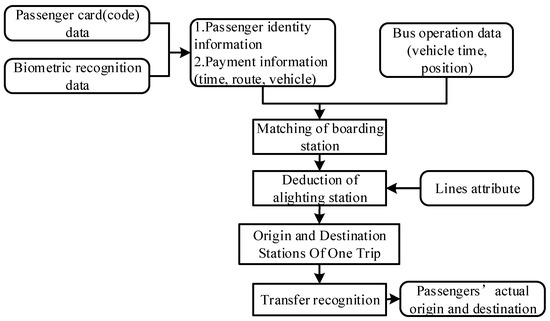In the adjustment of public transportation networks, passengers’ travel demand is manifested as the origin and destination (OD) stops, travel volume, and travel time distribution. With the traditional ‘four-stage method’, passengers’ travel needs are obtained based on manual surveys or statistical data sets. This article comprehensively uses passenger card (code) data, biometric-based payment data, and bus operation data (operating time, vehicle location, and operating route) to analyze the travel information of each passenger in the current bus network. The main steps for doing this include matching boarding stations, inferring alighting stations, and identifying the true origin and destination stops of transfers.Process of passenger travel demand analysis is shown below in Figure 3.