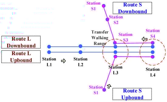 For an OD without direct lines, its core is the ‘transfer line’ analysis of all downstream stops from the origin stop. First, we find all the passing lines of the origin and destination stops through stop names and walking distances. Second, we find all downstream stops for the origin stop from the line model according to the lines, stop order, and direction. Third, we obtain the transfer line collection of all downstream stops according to the transfer model of each downstream stop. Finally, we compare the transfer line collection and the stopping line collection of the terminal stop; if , it means there is a single transfer path between the origin and the destination. We record the starting and ending stop, direction, distance, travel time, and transfer walking distance (space) of the upstream and downstream lines.