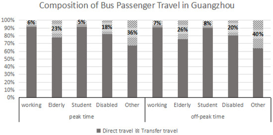 Passenger demographics and behavior significantly affect route selection. For example, by analyzing composition of Bus Passenger Travel in Guangzhou, as shown in Figure 5, we found that the elderly, disabled, and other passenger groups who enjoy high discounts have lower time sensitivity, and the proportion who choose transfer routes is close to or exceeds 20%. In contrast, the working group and student group prioritize timeliness, with less than 10% opting for transfer routes. In addition, the ratio of trips with transfers during off-peak periods slightly increases by two percentage points. These findings underscore the impact of passenger attributes, including travel time, on route selection.