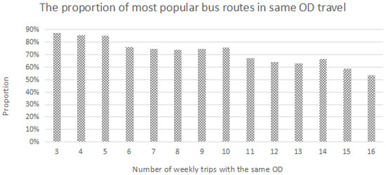 By tracking the frequency of trips on the same OD pair over a week, the most popular route for each passenger can be identified. The proportion of the most popular bus routes in the same OD travel is shown in Figure 6. From that, one can see that bus passengers tended to take a fixed route, with stronger preferences as trip frequency decreased. When the weekly travel frequency of the same OD is three times, the proportion of passengers who choose the same route is close to 90%. As the weekly travel frequency increases, this preference gradually decreases, but overall, it exceeds 50%. This indicates that passengers generally prefer familiar paths when selecting a route.