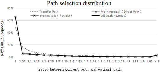 For all possible paths on a given OD pair, the efficiency is calculated for each path and compared to the optimal path. The path selection distribution is shown below in Figure 7, which indicates that the majority of passengers prefer the ‘optimal path’, whether for direct travel or transfer travel, with proportions reaching 65% and 50%, respectively. As increases, the likelihood of selection decreases, though the probability remains non-zero. Meanwhile, the distribution curve of different travel periods, such as peak and off-peak, basically coincides. In the case of transfers, passengers are less likely to take the ‘optimal’ path than they are for direct travel. This is mainly due to factors such as the integrity of information acquisition.