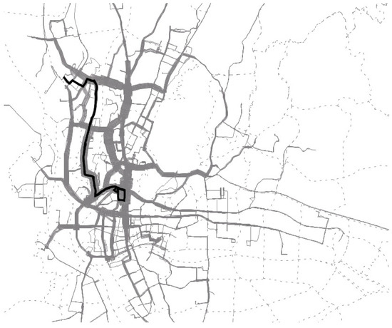Line 543 (highlighted in Figure 9), located in northwestern Guangzhou’s central urban area, features 27 stops and ceased operations on 18 June 2023. A pre-evaluation of passenger travel changes following route adjustments was performed and subsequently verified against real travel data collected on 20 July 2023. Prior to the route’s suspension, the daily passenger traffic volume was about 2290, with the line connected to 109 associated sub-network lines (depicted as gray solid lines in the figure), accounting for one-seventh of the bus lines in the central urban area of Guangzhou. The analysis reveals a complex network of 998 original stops and 978 destination stops within the sub-network, with calculations yielding 106,000 directly related OD pairs and a total of 2.77 million routes, corresponding to 560,000 passenger flows throughout the entire sub-network.