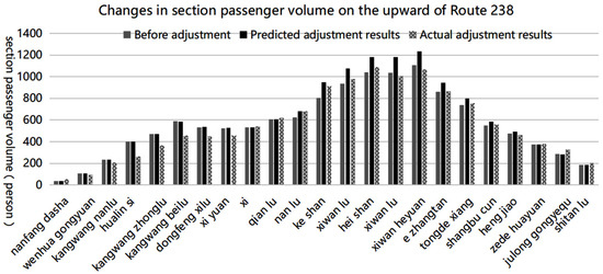 The pre-evaluation indicator system includes the transfer of passenger flows, the scale of affected passengers, the changes in the number of rides, the passenger profile, and the change in a line’s passenger section volume. The detailed indicators are shown in Table 4. Overall, the adjustment of Line 543 will not result in an increased number of unreachable passengers (including those who require more than two transfers to travel to their destinations), but there are 645 trips where the number of transfers increased by one accounting for 28% of all the passengers on Line 543. Of these trips, 328 of them (a total of 281 people) could be classified as rigid travel. Meanwhile, the affected flow of vulnerable groups such as the elderly, students, and the disabled were 128 trips, 14 trips, and 5 trips, respectively. There is also a certain rigidity in the overall travel habits, as they are more prone to complaints and require careful consideration.