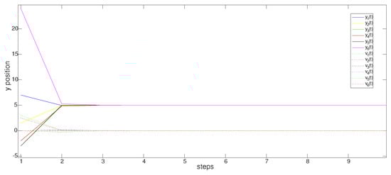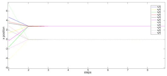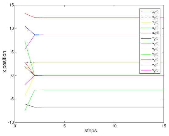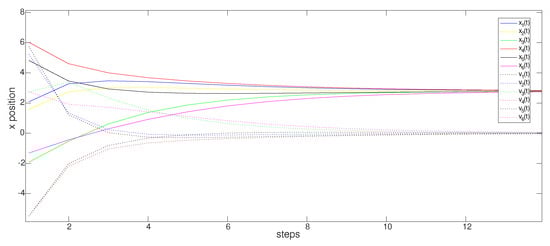 We consider the goal of achieving a static consensus condition, thus applying protocol (12). Protocol parameters and of (12) have been set equal to . In Figure 2, the evolution of the system running protocol (12) with no additional motion by the leader is plotted. In this simulation, it is straightforward to see that positions asymptotically move to a common value, while velocities are asymptotically zero. This is theoretically related to Equation (13).