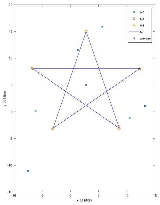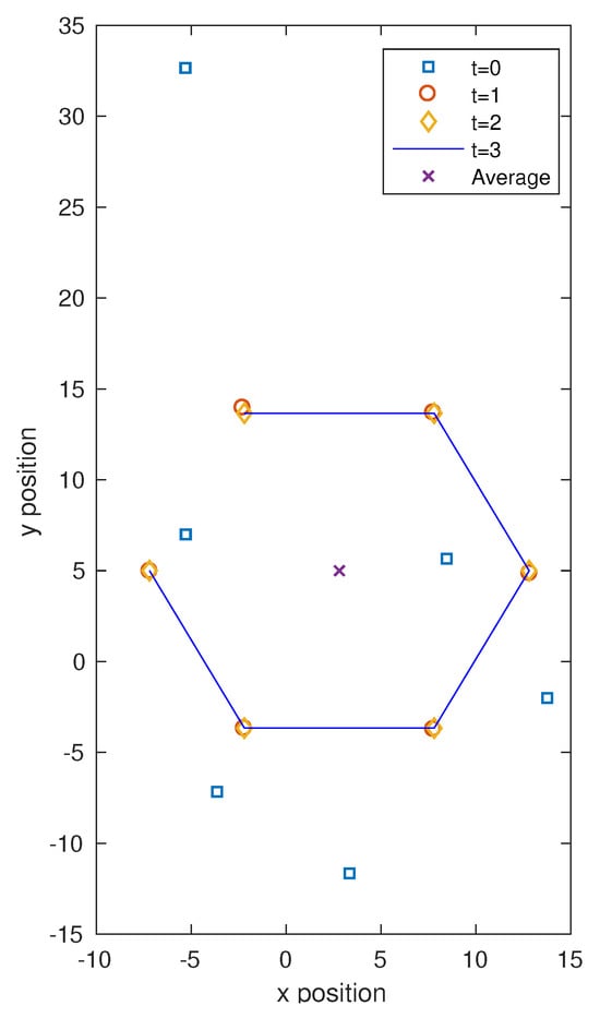 Figure 5 shows the x–y plot of the trajectory under protocol (73), thus showing the exagon shape of the reached formation clearly. It is worth noting that the multi-agent formation is centered around the consensus value of the initial conditions, and it may result in a key feature for several mission objectives.
