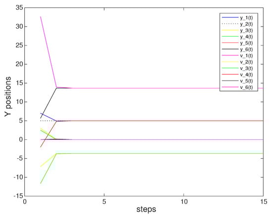 Evolution of multi-agent system trajectories under protocol (12) and leader action. Absolute positions of agents in the exagon configuration along the y direction.