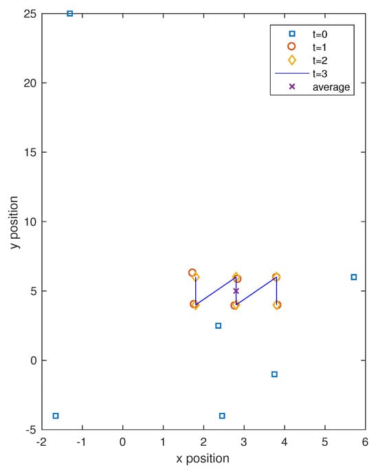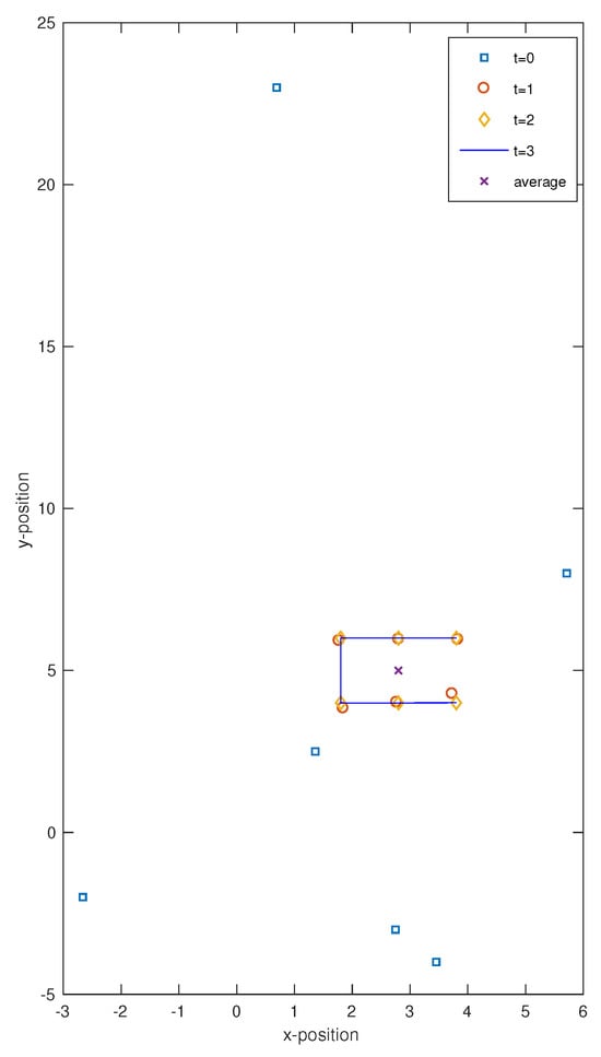 and it is possible to design cooperative distributed formation control strategies by applying either protocol (8) or (12) to . In particular, in this paper, we adopt the above strategy as applied in (Section 5 of [24]), where a time-varying desired geometric configuration is achieved through protocol (14) for a team of four multiple rotary-wing micro air vehicles. One main peculiarity of this approach is that the consensus value among nodes provides the formation center (see Figure 3 of [3]). We discuss this feature in detail later in Section 6.