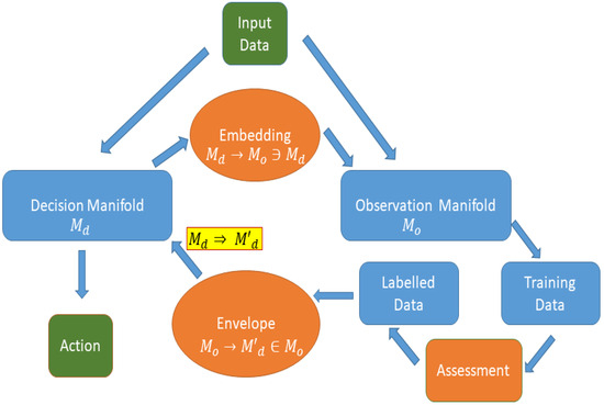 The generic description of our approach is illustrated in Figure 1. The green blocks represent the input and the output of an automated system. The blue block “Decision Manifold” represents a direct (without any adaptive reinforcement) reactive process. The reinforcement learning loop consists of an embedding (brown oval containing “Embedding”) step where the decision criteria are relaxed and define the “Observation Manifold” (blue box) in order to account for a larger variety of input events (the training data). An assessment procedure (brown rectangle containing “Assessment”) that can be either supervised or automated, labels the events as true or false (blue box containing “Labelled Data”). The labeled set of events provides an input for constructing an envelope of decision criteria (brown oval containing “Envelope”) that optimizes the detection of the true events and the rejection of the false ones. This decision envelope forms the reinforced, adapted, new decision manifold. The assumption is that our system detects a certain class of events from an input stream of data. Upon a detection, the system will proceed with a predefined action, like raising an alert or simply logging the event. The detection algorithm is encapsulated as , the “Detection Manifold”. The latter can be explicit or implicit (like in the case of trained classifiers), but in all cases, we assume that the event features fall into a certain area, or manifold, that defines them. The adaptive reinforcement involves on-the-move deforming or adapting according to the performance of the detector. This process should lead to both decreasing the number of false detections and avoiding undetected events. As our training process includes only events that are detected and not on screening the whole data history, we introduce an embedding procedure: