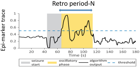Here, is the epileptic marker as an input signal, is the selected threshold, is the retrospective time interval (seconds or sample points), and is the selected minimal amount of time (or number of samples) when the epileptic marker is above the threshold. Note that in (4) we allow for the marker to move up and down across the threshold during the observation period as long as the total time above is longer than .