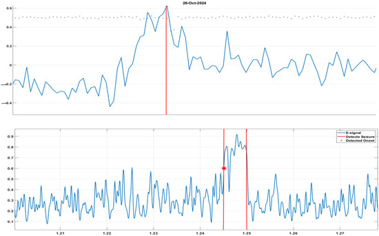 In Equation (8), are the thresholds for, correspondingly, the ictal and normal periods, and are the associated probabilities. We also postulate random ictal onset times. The seizure duration is a random number in the interval , where is a chosen maximal duration. The generated events are used as a ground truth in order to assess the performance of the detection and reinforcement processes. Figure 4 illustrates a trace of the epimarker from a real seizure as observed by our seizure-detection algorithm (top frame) and from a generated event (bottom frame). The parameters for the latter are , , .