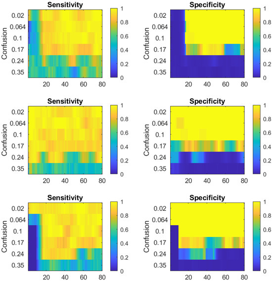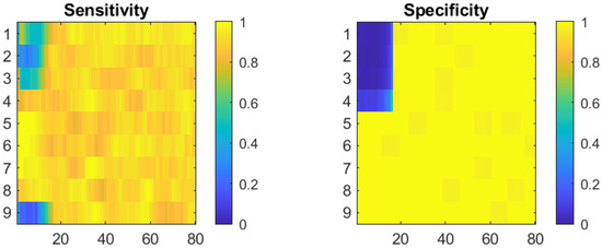 Also for this set of data, the sensitivity and specificity asymptotic behavior are shown in the boxplots of Figure 11. Statistical distributions of sensitivity (the left column of the plots) and specificity (the right column of the plots) derived from the last 50 epochs of the simulations of reinforcement procedure are shown as boxplots starting from the three various initial detector settings (each horizontal line of the plots) given in Table 2.