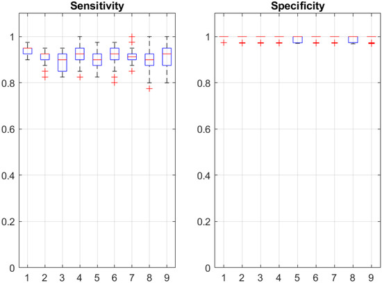 Statistical distributions of the sensitivity (left plot) and the specificity (right plot) derived from the last 50 epochs of the simulations of the reinforcement procedure starting from various initial detector settings, using the same data as shown in Figure 5. The vertical axes are the corresponding quantities and the horizontal axes represent the number of initial parameter sets, as given in Table 1. The boxes are the 25th–75th percentiles, the red lines are the median values, the whiskers denote the 5th–95th percentile values, and the red crosses are the outliers.