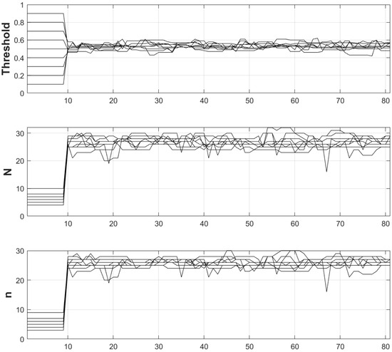 As demonstrated in Section 3.1 and visually presented in Figure 5, the proposed reinforcement parameter adaptation successfully converges to a detector with both high sensitivity and specificity performance. This is achieved from a variety of initial settings, some very “liberal”, allowing for many false positive detections, and others very “conservative”, skipping some real events. In all cases, here, we use the same event-generation parameters. The later correspond to a relatively good separation between normal and seizure epochs with a confusion factor of 0.02. From Figure 7, it is clear that for all initial values, the detector parameters reach approximately the same optimal levels due to the reinforcement algorithm. As the process is continuously active, certain fluctuations are present, but the system recovers its target parameters and shows asymptotic stability.