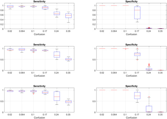 Statistical distributions of sensitivity (the left column of the plots) and specificity (the right column of the plots) for the same data as shown in Figure 8. Vertical axes represent the quantities; the labels on the horizontal axes indicate the various confusion factors as given in the sixth column of Table 3. The boxplot features are the same as those of Figure 6.