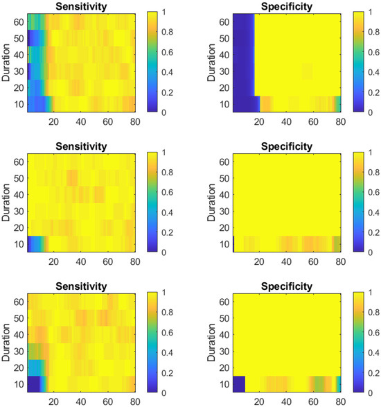 The final test explores the limits of the seizure event durations so that the approach will still be useful. The results shown in Figure 10 and Figure 11 show that, again, the sensitivity reaches high values independently of the initial detector settings for all maximal event durations ranging from 10 up to 60 simulation steps. The specificity trace, however, is not stable for short seizure events. For short seizures the algorithm will manage to restore an optimal detection sensitivity but at the expense of letting through false positive detections.