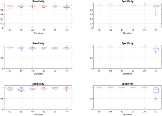 Figure 9 represents the statistics of the asymptotic behavior of the reinforcement procedure for these tests, taking, again, the last 50 epochs. Statistical distributions of sensitivity (the left column of the plots) and specificity (the right column of the plots) are shown as boxplots starting from the three various initial detector settings (each horizontal line of the plots) given in Table 2.