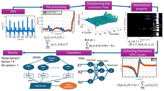 Methodology to classify sleep apnea. The first stage involves the data or ECG. The second stage involves pre-processing, where the ECG is cleaned. The third stage involves random field conversion. The fourth stage focuses on geometrical properties, where the excursion set is obtained. The fifth stage is feature extraction. Finally, the last stage involves selecting a classifier model (EKNN, SVM, FNN) to differentiate between an apnea patient and a non-apnea patient.