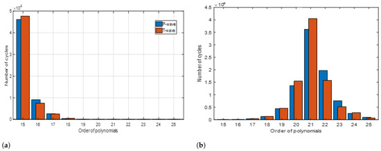 Polynomial order results for the sections of the ECG; sections and . (a) Histogram of the polynomials of P-waves (blue) and T-waves (red) using FIT (Equation (10)). (b) Histogram of the polynomials of P-waves (blue) and T-waves (red) using the IAE criterion.