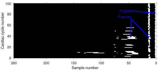 P-waves and R-peaks from the binary image (excursion set) at level = 0.2 for an apnea patient. The binary representation of the P-wave varies depending on the level of u.