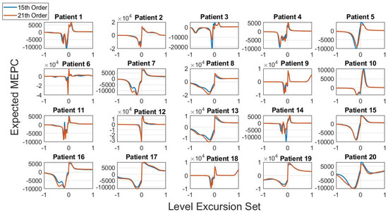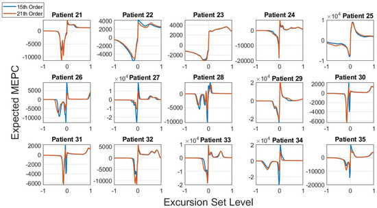 After that, the EPC is obtained for all apnea and non-apnea patients in the training set. Figure 6 shows the EPC for each apnea patient; the blue lines depict the results obtained with 15th-order polynomials, while the red lines indicate the behaviors associated with 21st-order polynomials. Figure 7 shows the borderline apnea patients (patients 21–25) and non-apnea patients (26–35), where we have the results of both polynomials, i.e., the blue lines denote 15th-order and the red lines denote 21st-order.