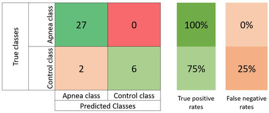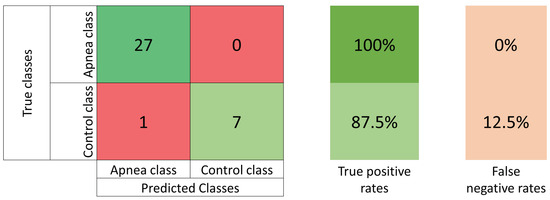 Confusion matrix for the test set using the balanced data. Class 0 represents the apnea patients, and class 1 represents the non-apnea patients.