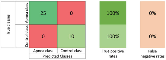OSA can be diagnosed using polysomnography; this method examines sleep and respiration parameters using electroencephalograms (EEGs), electrocardiograms (ECGs), and other measures, e.g., pulse oximetry (), airflow measurement, and so on [6,7]. This process is complex and time-consuming because it requires a complete test in a controlled environment to monitor the patient’s sleep and other signals. Also, this diagnosis is unfeasible and extremely expensive for a large population. Some alternative methods were developed using single ECG signals and machine learning techniques to diagnose OSA problems.