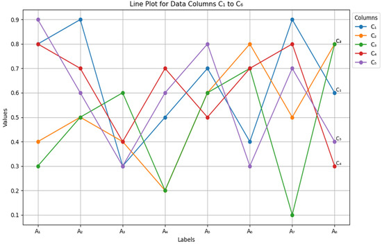 In order to the usefulness and feasibility of the newly proposed multiple attribute decision-making method related to TOPSIS, Zhang et al. [6] used the data related to an investment plan. The company needs to comprehensively consider the expected benefit, market saturation, environmental impact, social benefit, and energy saving degree of the eight investment plans proposed and select the best investment plan. The set of eight investment plans is , the corresponding attribute set of investment plans is , the benefit attribute is , and the cost attribute is . The set of weights corresponding to each attribute is , and the uniformized decision matrix corresponding to the eight investment alternatives is , as shown in Table 3. The visualization of Example 5 is presented in Figure 3.