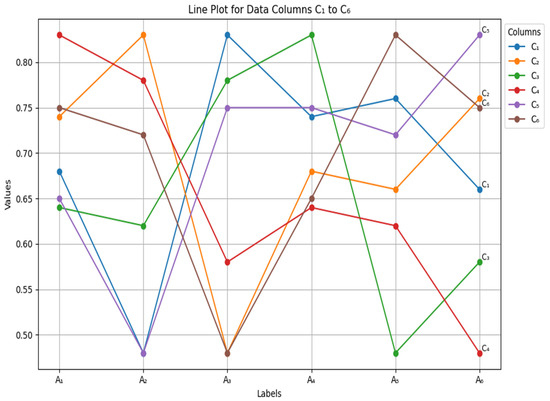 Ye et al. [29] considered the information of six manager candidates in the company and selected the manager candidates according to their health status, educational background, social ability, work style, writing ability and work experience, which were all benefit attributes. The set of manager candidates is , the corresponding set of attributes is , and the corresponding set of attribute weights is , as shown in Table 5 and Figure 5.