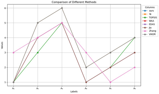 The weight information of Example 5 is changed to , and the final ranking result is changed to , as shown in Table 4 and in the visualization of comparison results with other methods shown in Figure 4. The ordering consequences of this method are consistent with other schemes or slightly different.