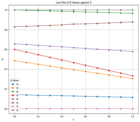 To further test the proposed method, Example 5 is used to quantitatively analyze the proposed method. Firstly, the sensitivity analysis of the decision-making mechanism coefficient in Equation (5) is carried out, and the values in the interval [0, 1] are taken in turn with a step of 0.1 to analyze the decision index value corresponding to the alternatives and the ranking order of the schemes. It can be observed from Figure 7 that with the continuous increase of , the proportion of the relative distance calculated by the group utility value becomes larger and larger. This means that the decision index value corresponding to the alternative with the smaller group utility value and the decision index value corresponding to the alternative with the larger single regret value and the group utility value corresponding to the alternative with the larger group utility value becomes larger and larger.