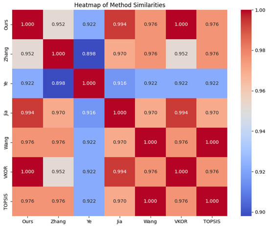 Next, the correlation between other methods and the ordering consequences of the proposed method is calculated by Example 5 as shown in Table 7 and Figure 8. It can be seen from Table 7 that the proposed method is significantly correlated with other methods and has high consistency in the ranking results.