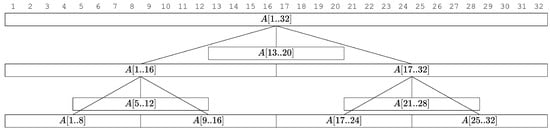 We will construct a tree data structure over the array A. Each node in the tree will have an associated subarray of A. We construct the tree structure over the array A recursively as follows: The tree’s root is associated with the entire array . We designate the root’s midpoint as . The root node is given a middle child, that is a leaf representing the subarray . We then recursively create two child subtrees: the left child subtree corresponds to , and the right child subtree corresponds to . If at any point the size of a subarray is at most , we treat the node as a leaf node. See Figure 2. For each node in the tree, we create the Gapped Set Intersection Data Structure from Lemma 1. For each leaf node, we create the Gapped Set Intersection Data Structure outlined in Lemma 1. See Algorithm 1 for pseudocode. Like in Section 2, these data structures are constructed over the non-empty subsets of each block, and we maintain the mapping from the query i and j to the corresponding non-empty subset if it exists. These details are omitted from the pseudocode.